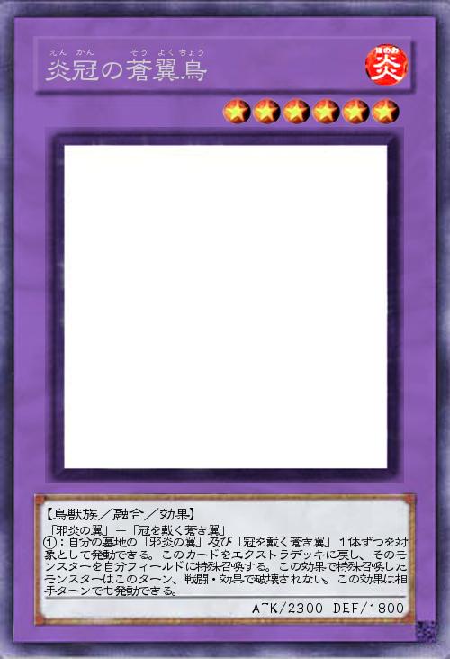 | 「邪炎の翼」+「冠を戴く蒼き翼」 ①:自分の墓地の「邪炎の翼」及び「冠を戴く蒼き翼」1体ずつを対象として発動できる。このカードをエクストラデッキに戻し、そのモンスターを自分フィールドに特殊召喚する。この効果で特殊召喚したモンスターはこのターン、戦闘・効果で破壊されない。この効果は相手ターンでも発動できる。 | |||