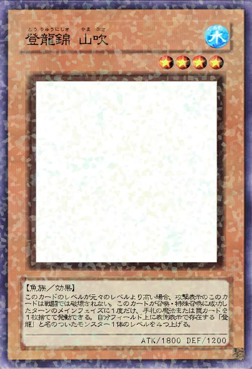 | このカードのレベルが元々のレベルより高い場合、攻撃表示のこのカードは戦闘では破壊されない。このカードが召喚・特殊召喚に成功したターンのメインフェイズに1度だけ、手札の魔法または罠カードを1枚捨てて発動できる。自分フィールド上に表側表示で存在する「登龍」と名のついたモンスター1体のレベルを4つ上げる。 | |||