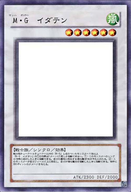 | 戦士族チューナー+チューナー以外の「M・G」と名のついたモンスター1体以上 「M・G イダテン」の①の効果は1ターンに1度しか発動できない。①:このモンスターのシンクロ召喚に成功したときに発動できる。自分の墓地に存在する速攻魔法1枚を手札に加える。②:このモンスターが自分フィールド上に存在し、自分が速攻魔法を発動したときに発動できる。相手に300ポイントのダメージを与える。 | |||