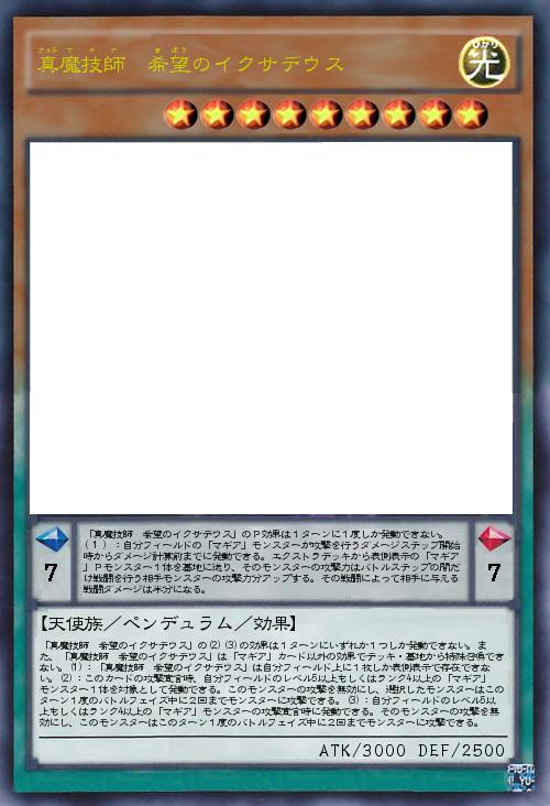 | 「真魔技師 希望のイクサデウス」の(2)(3)の効果は1ターンにいずれか1つしか発動できない。また、「真魔技師 希望のイクサデウス」は「マギア」カード以外の効果でデッキ・墓地から特殊召喚できない。(1):「真魔技師 希望のイクサデウス」は自分フィールド上に1枚しか表側表示で存在できない。(2):このカードの攻撃宣言時、自分フィールドのレベル5以上もしくはランク4以上の「マギア」モンスター1体を対象として発動できる。このモンスターの攻撃を無効にし、選択したモンスターはこのターン1度のバトルフェイズ中に2回までモンスターに攻撃できる。(3):自分フィールドのレベル5以上もしくはランク4以上の「マギア」モンスターの攻撃宣言時に発動できる。そのモンスターの攻撃を無効にし、このモンスターはこのターン1度のバトルフェイズ中に2回までモンスターに攻撃できる。 | |||