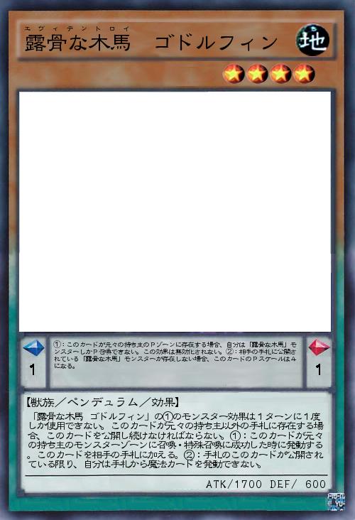 | ①:このカードが元々の持ち主のPゾーンに存在する場合、自分は「露骨な木馬」モンスターしかP召喚できない。この効果は無効化されない。②:相手の手札に公開されている「露骨な木馬」モンスターが存在しない場合、このカードのPスケールは4になる。 | |||
