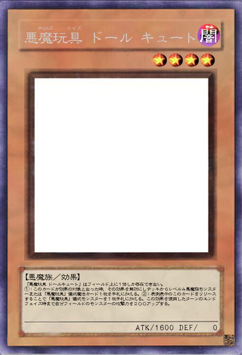 | 「悪魔玩具 ドールキュート」はフィールド上に1体しか存在できない。 ①:このカードが効果の対象となった時、その効果を無効にしデッキからレベル4悪魔族モンスターまたは「悪魔玩具」儀式魔法カード1枚を手札に加える。②:表側表示のこのカードをリリースすることで「悪魔玩具」儀式モンスターを1枚手札に加える。この効果を使用したターンのエンドフェイズ時まで自分フィールドのモンスターの攻撃力を200アップする。 | |||