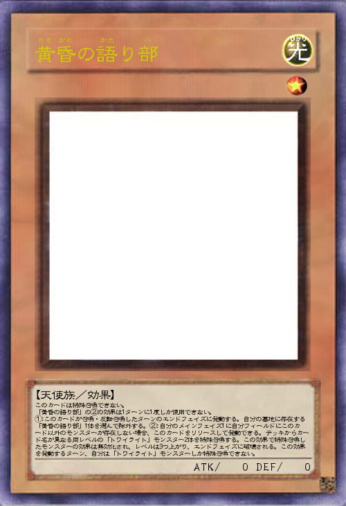 | このカードは特殊召喚できない。 「黄昏の語り部」の②の効果は1ターンに1度しか使用できない。 ①:このカードが召喚・反転召喚したターンのエンドフェイズに発動する。自分の墓地に存在する「黄昏の語り部」1体を選んで除外する。②:自分のメインフェイズ1に自分フィールドにこのカード以外のモンスターが存在しない場合、このカードをリリースして発動できる。デッキからカード名が異なる同レベルの「トワイライト」モンスター2体を特殊召喚する。この効果で特殊召喚したモンスターの効果は無効化され、レベルは3つ上がり、エンドフェイズに破壊される。この効果を発動するターン、自分は「トワイライト」モンスターしか特殊召喚できない。 | |||