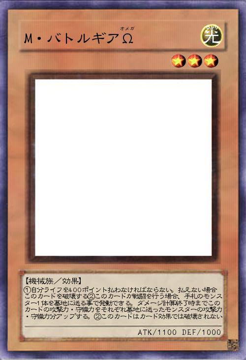 | ①自分ライフを400ポイント払わなければならない。払えない場合このカードを破壊する②このカードが戦闘を行う場合、手札のモンスター1体を墓地に送る事で発動できる。ダメージ計算終了時までこのカードの攻撃力・守備力をそれぞれ墓地に送ったモンスターの攻撃力・守備力分アップする。②このカードはカード効果では破壊されない | |||