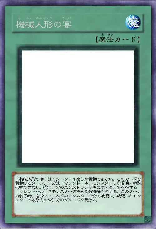 | 「機械人形の宴」は1ターンに1度しか発動できない。このカードを発動するターン、自分は「マシンドール」モンスターしか召喚・特殊召喚できない。①:自分のエクストラデッキに表側表示で存在する 「マシンドール」Pモンスターを任意の数特殊召喚する。このターンの終了時、自分フィールドのモンスターを全て破壊し、破壊したモンスターの攻撃力の合計分のダメージを受ける。 | |||
