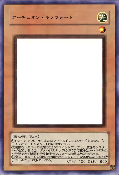 | ①1ターンに1度、手札またはフィールドのこのカードを自分の「アーチェオン」モンスター1体に装備できる。 ②装備モンスターの攻撃力は200ポイントアップし、装備モンスターが攻撃する場合、ダメージステップ終了時まで相手はカードの効果を発動できず戦闘を行う相手モンスターの効果は無効化される。 ③魔法、罠カードの効果で装備されたこのカードが墓地に送られた時、デッキから1枚ドローする。 | |||