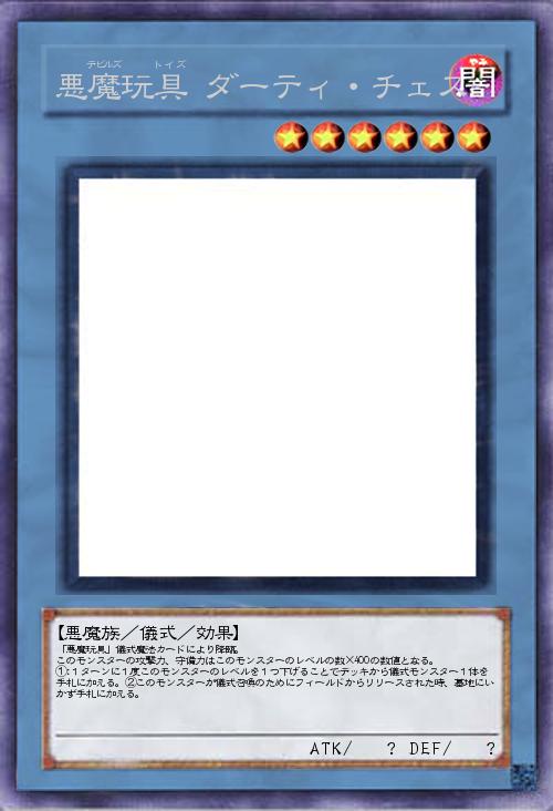 | 「悪魔玩具」儀式魔法カードにより降臨。 このモンスターの攻撃力、守備力はこのモンスターのレベルの数×400の数値となる。 ①:1ターンに1度このモンスターのレベルを1つ下げることでデッキから儀式モンスター1体を手札に加える。②このモンスターが儀式召喚のためにフィールドからリリースされた時、墓地にいかず手札に加える。 | |||