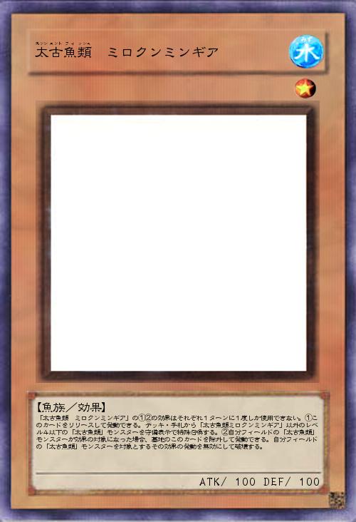| 「太古魚類 ミロクンミンギア」の①②の効果はそれぞれ1ターンに1度しか使用できない。①このカードをリリースして発動できる。デッキ・手札から「太古魚類ミロクンミンギア」以外のレベル4以下の「太古魚類」モンスターを守備表示で特殊召喚する。②自分フィールドの「太古魚類」モンスターが効果の対象になった場合、墓地のこのカードを除外して発動できる。自分フィールドの「太古魚類」モンスターを対象とするその効果の発動を無効にして破壊する。 | |||