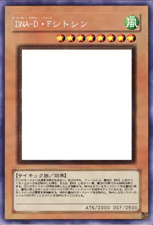 | ①このモンスターは通常召喚が出来ない。自分の手札、フィールド上、墓地の【DNA】と名のつくモンスター3体を除外した場合、または【DNA】と名のつく罠、魔法の効果でのみ特殊召喚できる。②このモンスターが特殊召喚したとき発動する。除外されているモンスター1体を墓地に戻し、墓地に戻したモンスターのレベル×300ポイントダメージを相手のライフに与える。③このモンスターの攻撃宣言時発動する。相手の墓地のモンスター1体を除外し、除外したモンスターのレベル×100ポイントダメージを相手のライフに与える。 | |||