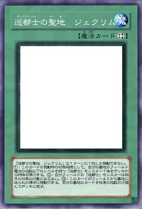 | 「巡都士の聖地 ジェクリム」は1ターンに1枚しか発動できない。①:このカードの発動時の効果処理として、自分の墓地のフィールド魔法の枚数以下のレベルを持つ「巡都士」モンスター1体をデッキから特殊召喚できる。②:自分フィールドの「巡都士」モンスターは相手の効果の対象にならない。③:このカードがフィールドから墓地に送られた場合に発動できる。自分の墓地のカードを任意の枚数だけ選んでデッキに戻す。 | |||