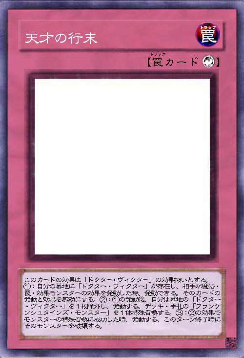 | このカードの効果は「ドクター・ヴィクター」の効果扱いとする。 ①:自分の墓地に「ドクター・ヴィクター」が存在し、相手が魔法・罠・効果モンスターの効果を発動した時、発動できる。そのカードの発動と効果を無効にする。②:①の発動後、自分は墓地の「ドクター・ヴィクター」を1枚除外し、発動する。デッキ・手札の「フランケンシュタインズ・モンスター」を1体特殊召喚する。③:②の効果でモンスターの特殊召喚に成功した時、発動する。このターン終了時にそのモンスターを破壊する。 | |||