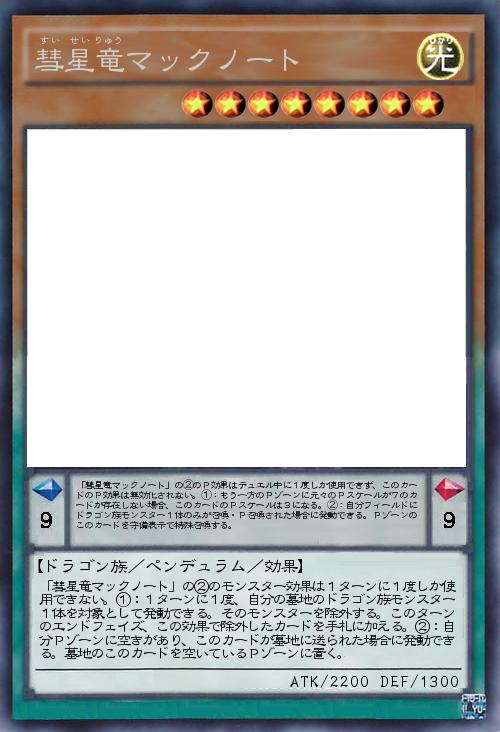| 「彗星竜マックノート」の②のP効果はデュエル中に1度しか使用できず、このカードのP効果は無効化されない。①:もう一方のPゾーンに元々のPスケールが7のカードが存在しない場合、このカードのPスケールは3になる。②:自分フィールドにドラゴン族モンスター1体のみが召喚・P召喚された場合に発動できる。Pゾーンのこのカードを守備表示で特殊召喚する。 | |||