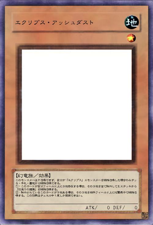| このモンスターはP召喚できず、自分が「エクリプス」Xモンスターを特殊召喚した場合のみデッキ・手札・墓地から特殊召喚できる。 ①:このカードが自分フィールド上に3枚存在する場合、その3枚を全て除外してEXデッキから「灰造りの龍像」を特殊召喚する。 ②:除外されているこのカードが3枚ある場合、その3枚を相手フィールド上に攻撃表示で特殊召喚する。この効果はデュエル中1度しか使用できない。 | |||