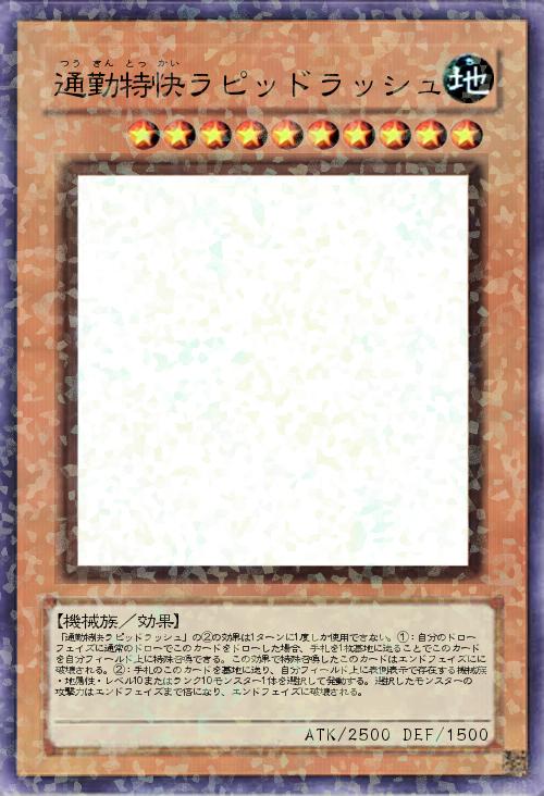 | 「通勤特快ラピッドラッシュ」の②の効果は1ターンに1度しか使用できない。①:自分のドローフェイズに通常のドローでこのカードをドローした場合、手札を1枚墓地に送ることでこのカードを自分フィールド上に特殊召喚できる。この効果で特殊召喚したこのカードはエンドフェイズにに破壊される。②:手札のこのカードを墓地に送り、自分フィールド上に表側表示で存在する機械族・地属性・レベル10またはランク10モンスター1体を選択して発動する。選択したモンスターの攻撃力はエンドフェイズまで倍になり、エンドフェイズに破壊される。 | |||