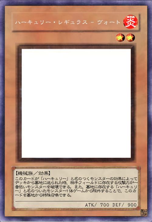 | このカードが「ハーキュリー」と名のつくモンスターの効果によってデッキから墓地に送られた時、相手フィールドに存在する攻撃力が一番低いモンスターを破壊できる。また、墓地に存在する「ハーキュリー」と名のついたモンスター1体ゲームから除外することで、このカードを墓地から特殊召喚できる。 | |||