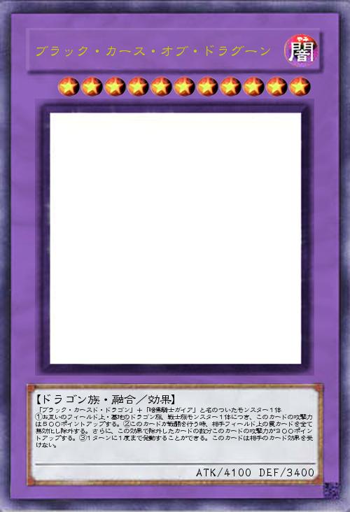 | 「ブラック・カースド・ドラゴン」+「暗黒騎士ガイア」と名のついたモンスター1体 ①お互いのフィールド上・墓地のドラゴン族、戦士族モンスター1体につき、このカードの攻撃力は500ポイントアップする。②このカードが戦闘を行う時、相手フィールド上の罠カードを全て無効化し除外する。さらに、この効果で除外したカードの数分このカードの攻撃力が300ポイントアップする。③1ターンに1度まで発動することができる。このカードは相手のカード効果を受けない。 | |||