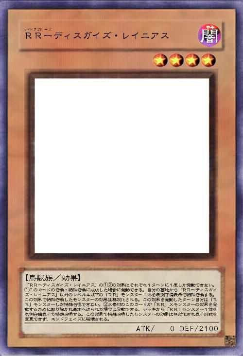 | 「RRーディスガイズ・レイニアス」の①②の効果はそれぞれ1ターンに1度しか発動できない。①このカードの召喚・特殊召喚に成功した場合に発動できる。自分の墓地から「RRーディスガイズ・レイニアス」以外のレベル4以下の「RR」モンスター1体を表側守備表示で特殊召喚する。この効果で特殊召喚したモンスターの効果は無効化される。この効果を発動したターン自分は「RR」モンスターしか特殊召喚できない。②X素材のこのカードが「RR」Xモンスターの効果を発動するために取り除かれ墓地へ送られた場合に発動できる。デッキから「RR」モンスター1体を表側守備表示で特殊召喚する。この効果で特殊召喚したモンスターの効果は無効化され表示形式を変更できず、エンドフェイズに破壊される。 | |||