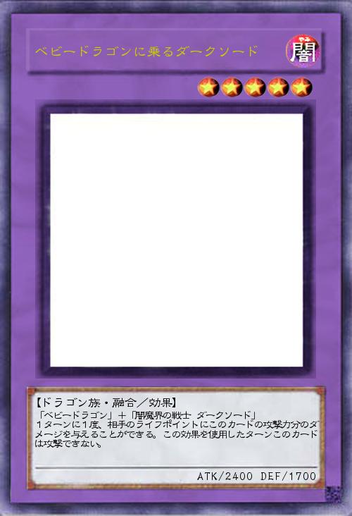 | 「ベビードラゴン」+「闇魔界の戦士 ダークソード」 1ターンに1度、相手のライフポイントにこのカードの攻撃力分のダメージを与えることができる。この効果を使用したターンこのカードは攻撃できない。 | |||