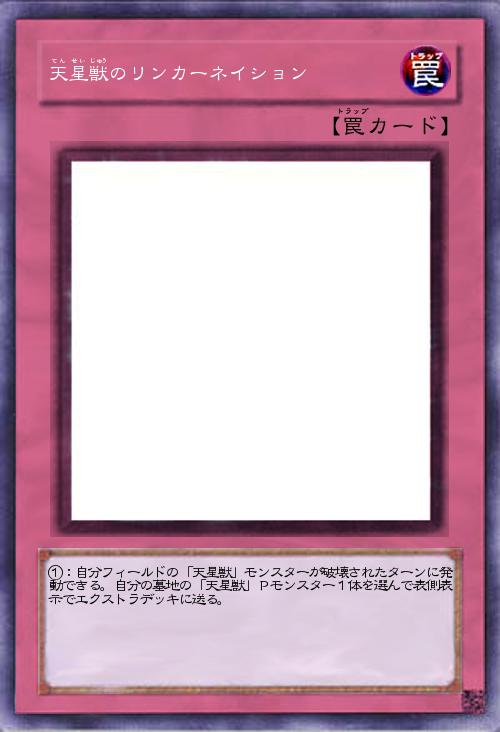 | ①:自分フィールドの「天星獣」モンスターが破壊されたターンに発動できる。自分の墓地の「天星獣」Pモンスター1体を選んで表側表示でエクストラデッキに送る。 | |||