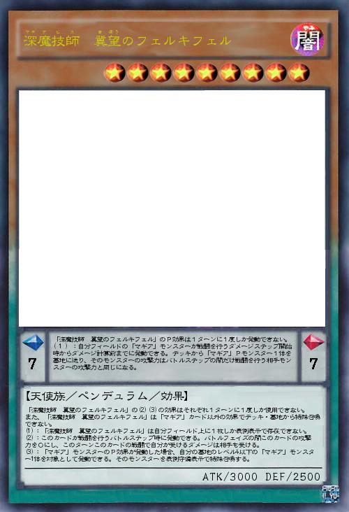 | 「深魔技師 冀望のフェルキフェル」の(2)(3)の効果はそれぞれ1ターンに1度しか使用できない。 また、「深魔技師 冀望のフェルキフェル」は「マギア」カード以外の効果でデッキ・墓地から特殊召喚できない。 (1):「深魔技師 冀望のフェルキフェル」は自分フィールド上に1枚しか表側表示で存在できない。 (2):このカードが戦闘を行うバトルステップ時に発動できる。バトルフェイズの間このカードの攻撃力を0にし、このターンこのカードの戦闘で自分が受けるダメージは相手も受ける。 (3):「マギア」モンスターのP効果が発動した場合、自分の墓地のレベル4以下の「マギア」モンスター1体を対象として発動できる。そのモンスターを表側守備表示で特殊召喚する。 | |||