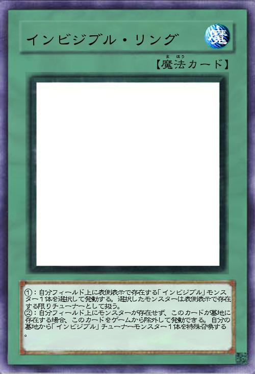 | ①:自分フィールド上に表側表示で存在する「インビジブル」モンスター1体を選択して発動する。選択したモンスターは表側表示で存在する限りチューナーとして扱う。 ②:自分フィールド上にモンスターが存在せず、このカードが墓地に存在する場合、このカードをゲームから除外して発動できる。自分の墓地から「インビジブル」チューナーモンスター1体を特殊召喚する。 | |||