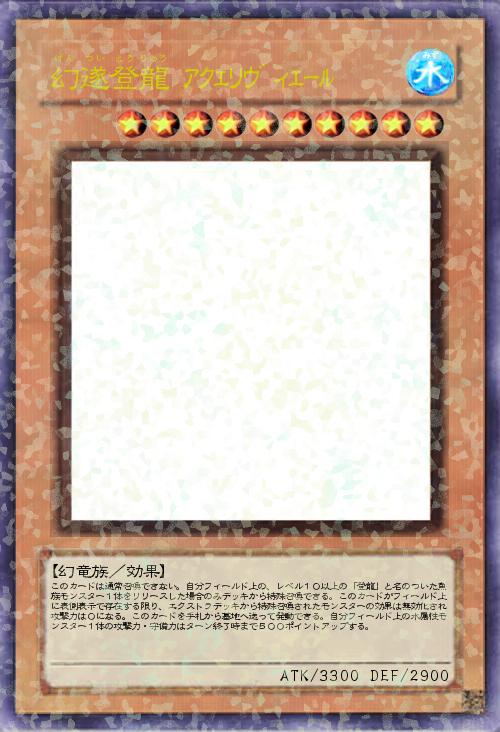 | このカードは通常召喚できない。自分フィールド上の、レベル10以上の「登龍」と名のついた魚族モンスター1体をリリースした場合のみデッキから特殊召喚できる。このカードがフィールド上に表側表示で存在する限り、エクストラデッキから特殊召喚されたモンスターの効果は無効化され攻撃力は0になる。このカードを手札から墓地へ送って発動できる。自分フィールド上の水属性モンスター1体の攻撃力・守備力はターン終了時まで500ポイントアップする。 | |||