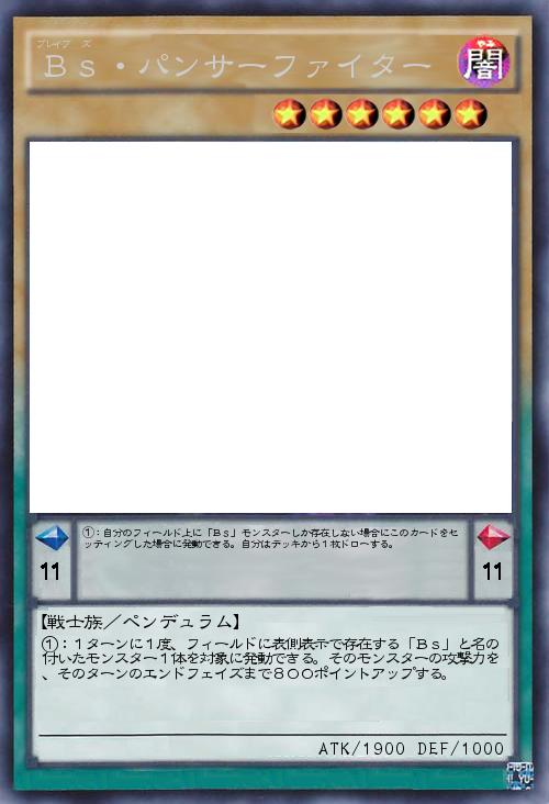 | ①:1ターンに1度、フィールドに表側表示で存在する「Bs」と名の付いたモンスター1体を対象に発動できる。そのモンスターの攻撃力を、そのターンのエンドフェイズまで800ポイントアップする。 | |||