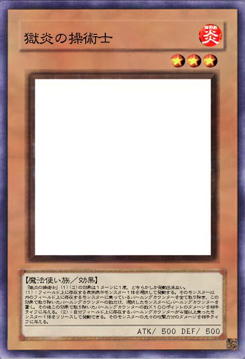 | 「獄炎の操術士」(1)(2)の効果は1ターンに1度、どちらかしか発動出来ない。 (1):フィールド上に存在する表側表示モンスター1体を選択して発動する。そのモンスター以外のフィールド上に存在するモンスターに乗っているバーニングカウンターを全て取り除き、この効果で取り除いたバーニングカウンターの数だけ、選択したモンスターにバーニングカウンターを置く。その後この効果で取り除いたバーニングカウンターの数×100ポイントのダメージを相手ライフに与える。(2):自分フィールド上に存在するバーニングカウンターが4個以上乗ったモンスター1体をリリースして発動できる。そのモンスターの元々の攻撃力分のダメージを相手ライフに与える。 | |||