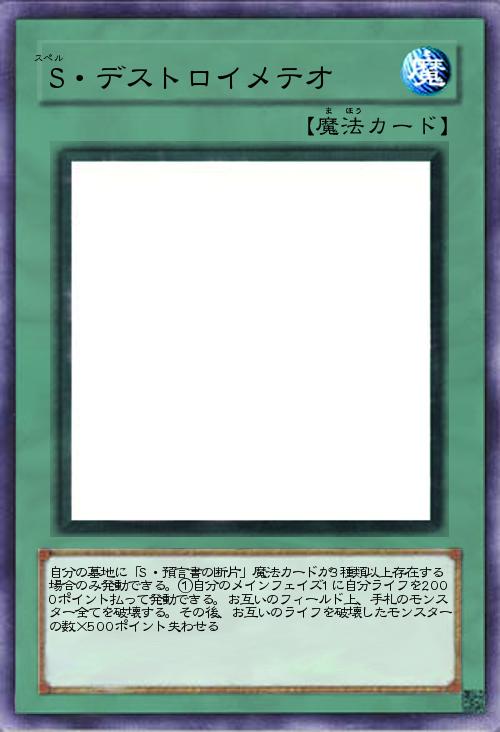 | 自分の墓地に「S・預言書の断片」魔法カードが3種類以上存在する場合のみ発動できる。①自分のメインフェイズ1に自分ライフを2000ポイント払って発動できる。お互いのフィールド上、手札のモンスター全てを破壊する。その後、お互いのライフを破壊したモンスターの数×500ポイント失わせる | |||