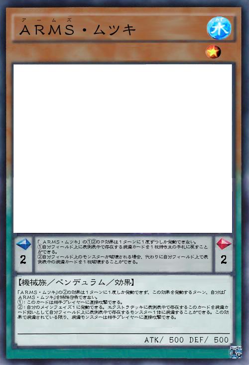 | 「ARMS・ムツキ」の①②のP効果は1ターンに1度ずつしか発動できない。 ①自分フィールド上に表側表示で存在する装備カードを1枚持ち主の手札に戻すことができる。 ②自分フィールド上のモンスターが破壊される場合、代わりに自分フィールド上で表側表示の装備カードを1枚破壊することができる。 | |||