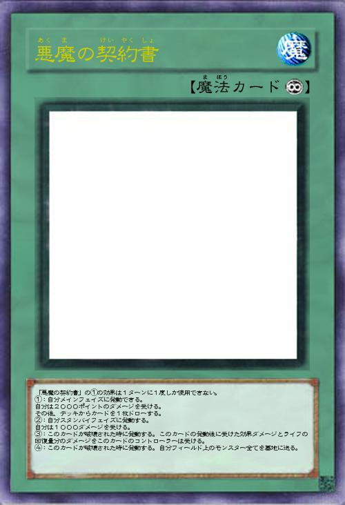 | 「悪魔の契約書」の①の効果は1ターンに1度しか使用できない。 ①:自分メインフェイズに発動できる。 自分は2000ポイントのダメージを受ける。 その後、デッキからカードを1枚ドローする。 ②:自分スタンバイフェイズに発動する。 自分は1000ダメージを受ける。 ③:このカードが破壊された時に発動する。このカードの発動後に受けた効果ダメージとライフの回復量分のダメージをこのカードのコントローラーは受ける。 ④:このカードが破壊された時に発動する。自分フィールド上のモンスター全てを墓地に送る。 | |||