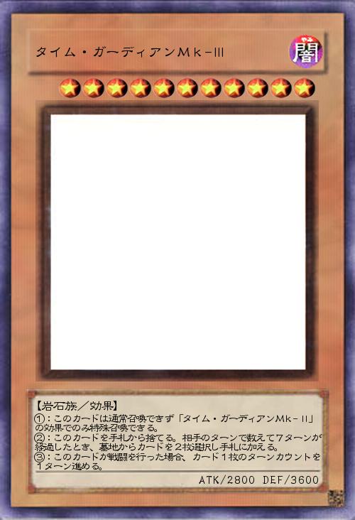 | ①:このカードは通常召喚できず「タイム・ガーディアンMk-Ⅱ」の効果でのみ特殊召喚できる。 ②:このカードを手札から捨てる。相手のターンで数えて7ターンが経過したとき、墓地からカードを2枚選択し手札に加える。 ③:このカードが戦闘を行った場合、カード1枚のターンカウントを1ターン進める。 | |||