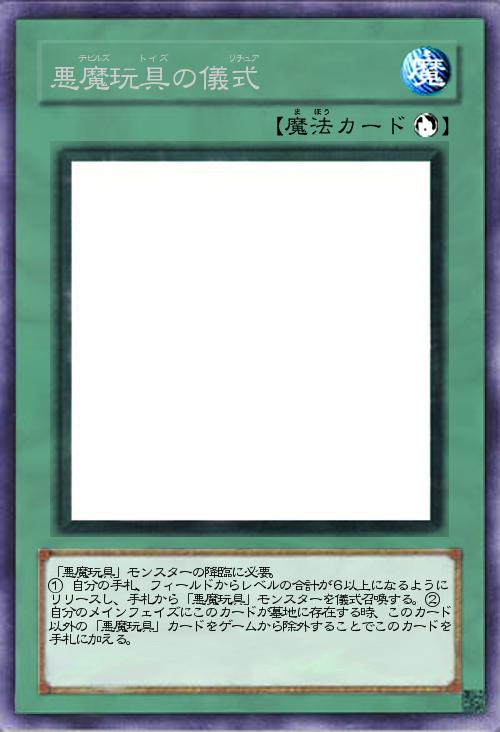 | 「悪魔玩具」モンスターの降臨に必要。 ① 自分の手札、フィールドからレベルの合計が6以上になるようにリリースし、手札から「悪魔玩具」モンスターを儀式召喚する。② 自分のメインフェイズにこのカードが墓地に存在する時、このカード以外の「悪魔玩具」カードをゲームから除外することでこのカードを手札に加える。 | |||