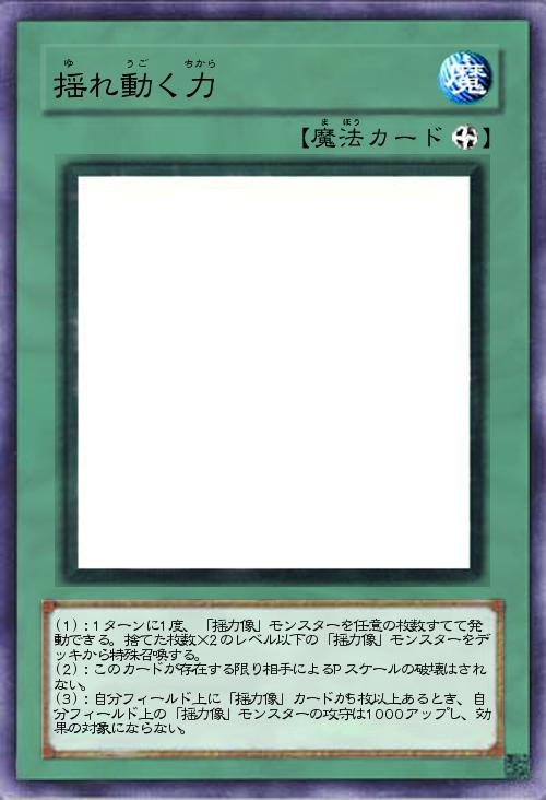 | (1):1ターンに1度、「揺力像」モンスターを任意の枚数すてて発動できる。捨てた枚数×2のレベル以下の「揺力像」モンスターをデッキから特殊召喚する。 (2):このカードが存在する限り相手によるPスケールの破壊はされない。 (3):自分フィールド上に「揺力像」カードが5枚以上あるとき、自分フィールド上の「揺力像」モンスターの攻守は1000アップし、効果の対象にならない。 | |||