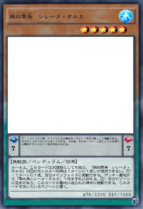 | ルール上、このカードは天使族としても扱う。「振双零鳥 シレーヌ・オルカ」の②のモンスター効果は1ターンに1度しか使用できない。①:1ターンに1度、自分メインフェイズに発動できる。デッキ・墓地から「零水鳥シレーヌ・オルカ」1枚を手札に加える。②:自分Pゾーンに空きがあり、このカードが墓地に送られた場合に発動できる。このカードを空いているPゾーンに置く。 | |||