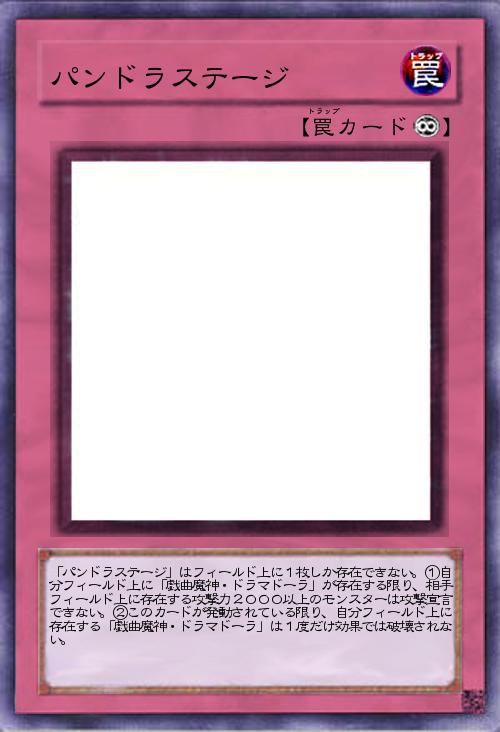 | 「パンドラステージ」はフィールド上に1枚しか存在できない。①自分フィールド上に「戯曲魔神・ドラマドーラ」が存在する限り、相手フィールド上に存在する攻撃力2000以上のモンスターは攻撃宣言できない。②このカードが発動されている限り、自分フィールド上に存在する「戯曲魔神・ドラマドーラ」は1度だけ効果では破壊されない。 | |||