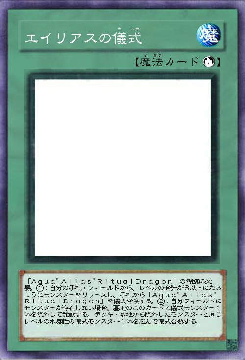 | 「Aqua"Alias"RitualDragon」の降臨に必 要。①:自分の手札・フィールドから、レベルの合計が8以上になるようにモンスターをリリースし、手札から「Aqua"Alias"RitualDragon」を儀式召喚する。②:自分フィールドにモンスターが存在しない場合、墓地のこのカードと儀式モンスター1体を除外して発動する。デッキ・墓地から除外したモンスターと同じレベルの水属性の儀式モンスター1体を選んで儀式召喚する。 | |||