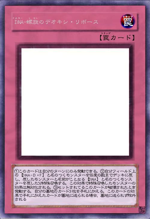 | ①このカードは自分のターンにのみ発動できる。②自分フィールド上の【DNA-D・F】と名のつくモンスターを任意の数までデッキに戻し、戻したモンスターと名前がことなる【DNA】と名のつくモンスターを戻した分特殊召喚する。この効果で特殊召喚したモンスターの効果は無効化される。③セットされてるこのカードが破壊されたとき発動する。自分の墓地のカード3枚を手札に加える。このカードの効果で手札に加えたカードが墓地に送られる場合、墓地に送られず除外される | |||