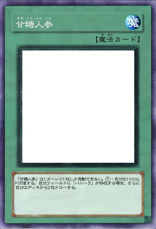 | 「甘糖人参」は1ターンに1枚しか発動できない。①:自分は1000LP回復する。自分フィールドに「バニーラ」が存在する場合、さらに自分はデッキから2枚ドローする。 | |||
