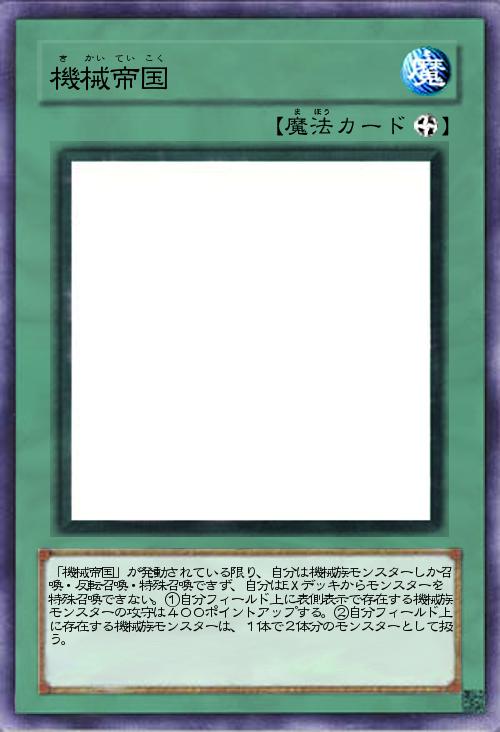 | 「機械帝国」が発動されている限り、自分は機械族モンスターしか召喚・反転召喚・特殊召喚できず、自分はEXデッキからモンスターを特殊召喚できない。①自分フィールド上に表側表示で存在する機械族モンスターの攻守は400ポイントアップする。②自分フィールド上に存在する機械族モンスターは、1体で2体分のモンスターとして扱う。 | |||