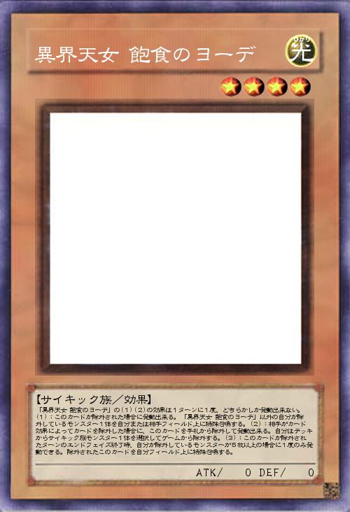 | 「異界天女 飽食のヨーデ」の(1)(2)の効果は1ターンに1度、どちらかしか発動出来ない。 (1):このカードが除外された場合に発動出来る。「異界天女 飽食のヨーデ」以外の自分が除外しているモンスター1体を自分または相手フィールド上に特殊召喚する。(2):相手がカード効果によってカードを除外した場合に、このカードを手札から除外して発動出来る。自分はデッキからサイキック族モンスター1体を選択してゲームから除外する。(3):このカードが除外されたターンのエンドフェイズ終了時、自分が除外しているモンスターが5枚以上の場合に1度のみ発動できる。除外されたこのカードを自分フィールド上に特殊召喚する。 | |||