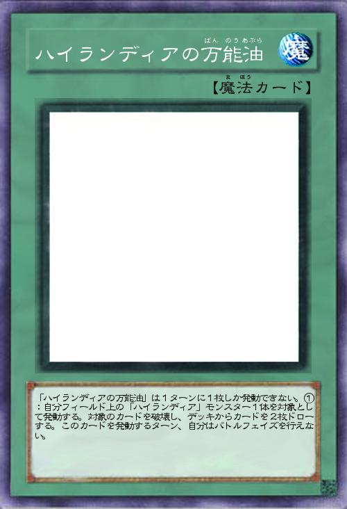 | 「ハイランディアの万能油」は1ターンに1枚しか発動できない。①:自分フィールド上の「ハイランディア」モンスター1体を対象として発動する。対象のカードを破壊し、デッキからカードを2枚ドローする。このカードを発動するターン、自分はバトルフェイズを行えない。 | |||