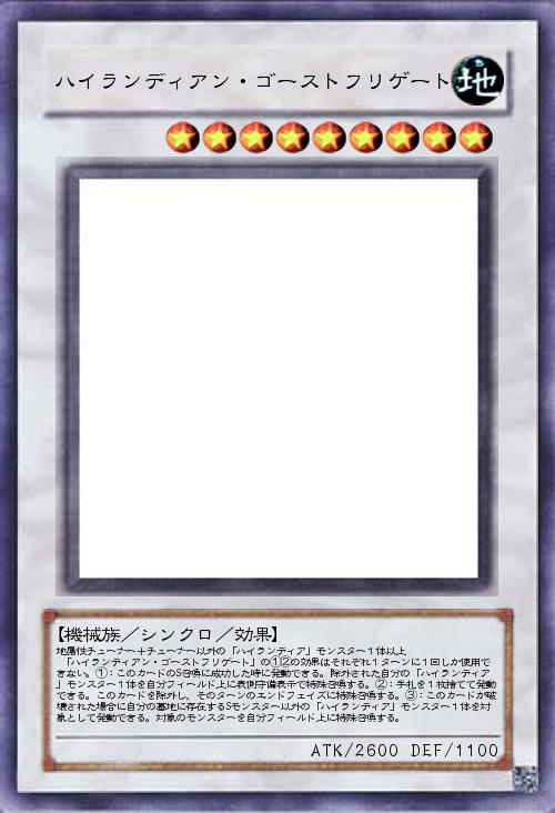 | 地属性チューナー+チューナー以外の「ハイランディア」モンスター1体以上 「ハイランディアン・ゴーストフリゲート」の①②の効果はそれぞれ1ターンに1回しか使用できない。①:このカードのS召喚に成功した時に発動できる。除外された自分の「ハイランディア」モンスター1体を自分フィールド上に表側守備表示で特殊召喚する。②:手札を1枚捨てて発動できる。このカードを除外し、そのターンのエンドフェイズに特殊召喚する。③:このカードが破壊された場合に自分の墓地に存在するSモンスター以外の「ハイランディア」モンスター1体を対象として発動できる。対象のモンスターを自分フィールド上に特殊召喚する。 | |||