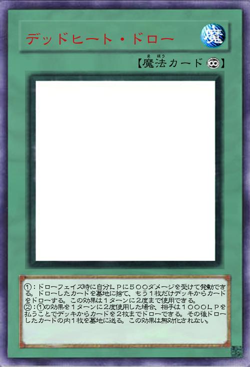 | ①:ドローフェイズ時に自分LPに500ダメージを受けて発動できる。ドローしたカードを墓地に捨て、もう1枚だけデッキからカードをドローする。この効果は1ターンに2度まで使用できる。 ②:①の効果を1ターンに2度使用した場合、相手は1000LPを払うことでデッキからカードを2枚までドローできる。その後ドローしたカードの内1枚を墓地に送る。この効果は無効化されない。 | |||