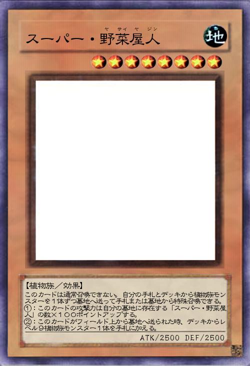 | このカードは通常召喚できない。自分の手札とデッキから植物族モンスターを1体ずつ墓地へ送って手札または墓地から特殊召喚できる。 ①:このカードの攻撃力は自分の墓地に存在する「スーパー・野菜屋人」の数×100ポイントアップする。 ②:このカードがフィールド上から墓地へ送られた時、デッキからレベル9植物族モンスター1体を手札に加える。 | |||