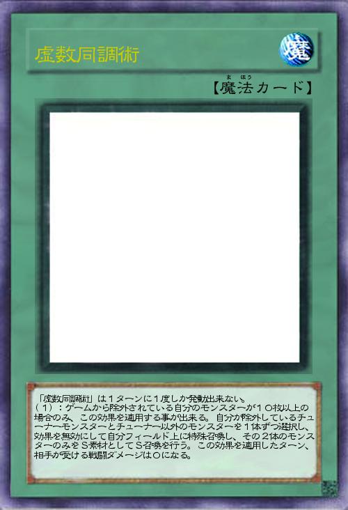 | 「虚数同調術」は1ターンに1度しか発動出来ない。 (1):ゲームから除外されている自分のモンスターが10枚以上の場合のみ、この効果を適用する事が出来る。自分が除外しているチューナーモンスターとチューナー以外のモンスターを1体ずつ選択し、効果を無効にして自分フィールド上に特殊召喚し、その2体のモンスターのみをS素材としてS召喚を行う。この効果を適用したターン、相手が受ける戦闘ダメージは0になる。 | |||