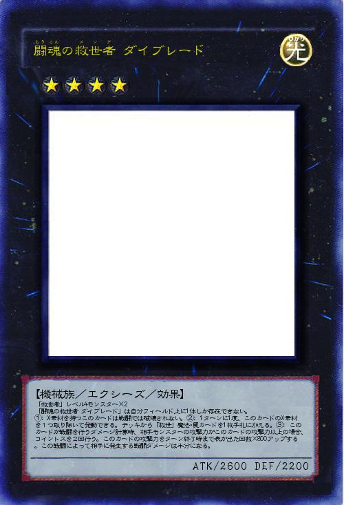 | 「救世者」レベル4モンスター×2 「闘魂の救世者 ダイブレード」は自分フィールド上に1体しか存在できない。 ①: X素材を持つこのカードは戦闘では破壊されない。②: 1ターンに1度、このカードのX素材を1つ取り除いて発動できる。デッキから「救世」魔法・罠カードを1枚手札に加える。③: このカードが戦闘を行うダメージ計算時、相手モンスターの攻撃力がこのカードの攻撃力以上の場合、コイントスを2回行う。このカードの攻撃力をターン終了時まで表が出た回数×800アップする。この戦闘によって相手に発生する戦闘ダメージは半分になる。 | |||