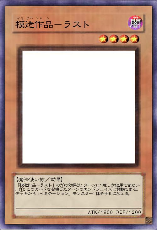 | 「模造作品-ラスト」の①の効果は1ターンに1度しか使用できない。①:このカードを召喚したターンのエンドフェイズに発動できる。デッキから「イミテーション」モンスター1体を手札に加える。 | |||