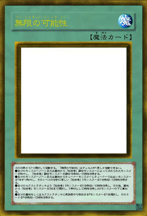 | 次の効果から1つ選択して発動する。「無限の可能性」はデュエル中1度しか発動できない。 ●自分のモンスターゾーンまたは墓地から「救世者」融合モンスターによって決められたモンスターを除外し、「救世者」融合モンスターを融合召喚扱いで特殊召喚する。 ●自分のモンスターゾーンまたは墓地からチューナーモンスターとチューナーではないモンスターを1体ずつ除外し、そのレベルの合計に等しい「救世者」SモンスターをS召喚扱いで特殊召喚する。 ●自分のエクストラデッキより「救世者」XモンスターをX召喚扱いで特殊召喚し、その後、墓地から「救世者」モンスターを2枚まで選択し、X素材として特殊召喚したXモンスターの下に重ねる。 ●自分の墓地もしくはエクストラデッキに表側表示で存在するPモンスターを1体選択し、そのカードをP召喚扱いで特殊召喚する。 | |||