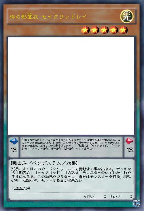| ①もう片方のPゾーンに存在するカードとこのカードを破壊する事で発動出来る。このターン自分は儀式召喚、S召喚、X召喚を行う場合デッキのモンスターを素材とする事が出来る。ただしこの効果を使うターン、「影霊衣」「セイクリッド」「ガスタ」モンスターしか召喚、特殊召喚、反転召喚、セット出来ない | |||